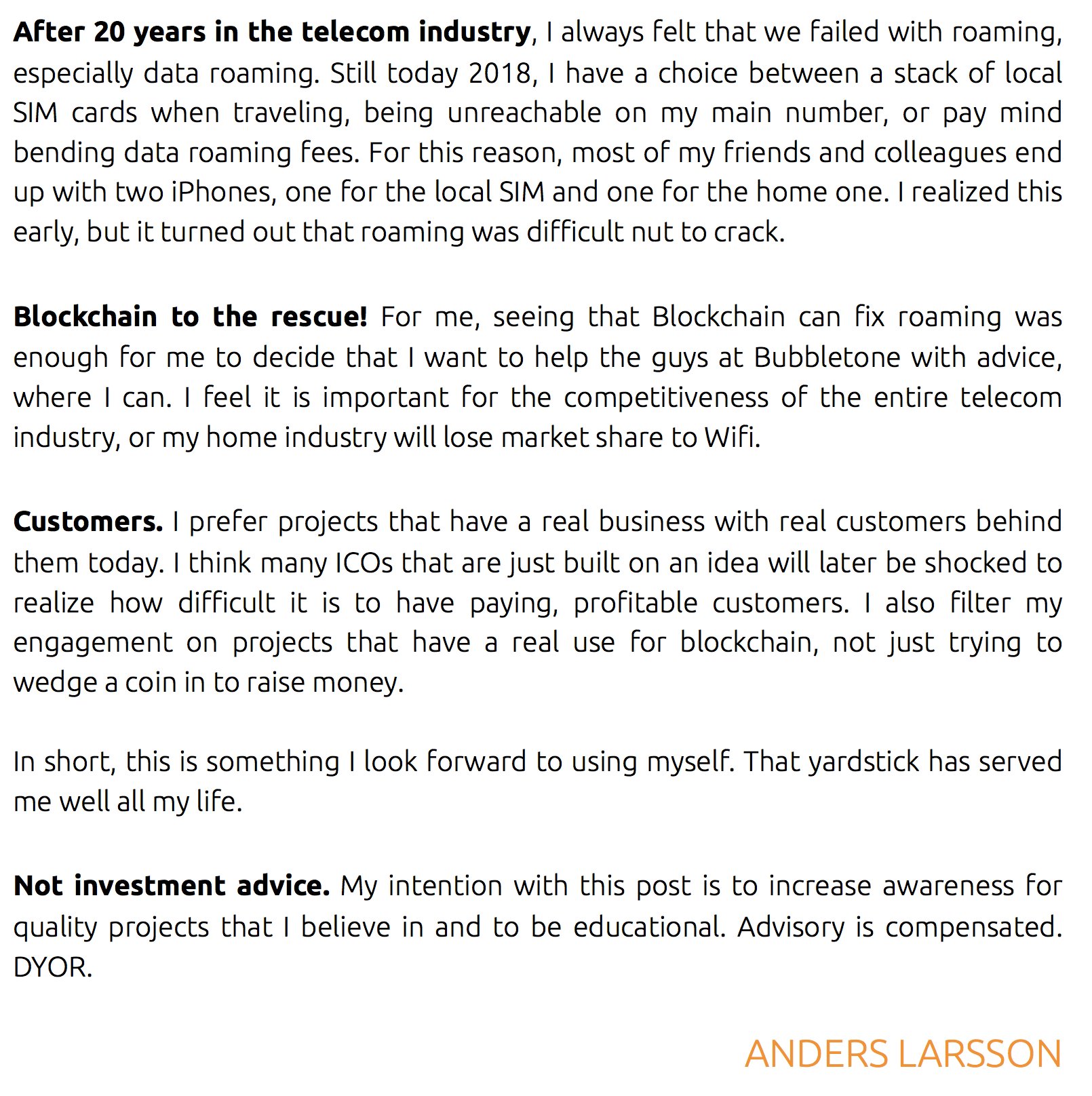 BubbleTone Blockchain u Telekomu - Prvi decentralizirani telekomunikacijski ekosustav. Omogućuje operaterima mobilnih mrea, korisnicima telefona i davateljima usluga izravno komuniciranje.